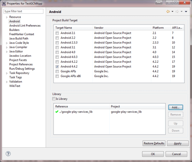 Point it to the TestGCMApp project and setup the Target.