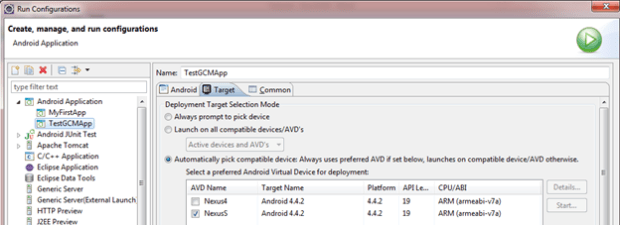 - Once installed, create a new AVD that uses the Google API system image you just downloaded. Update the project run configuration to use the new AVD. (As detailed in the test section above). Note: If the AVD manager does not show Google APIs in the target, as below, then you might need to re-start Eclipse & re-start AVD manager to see the changes.