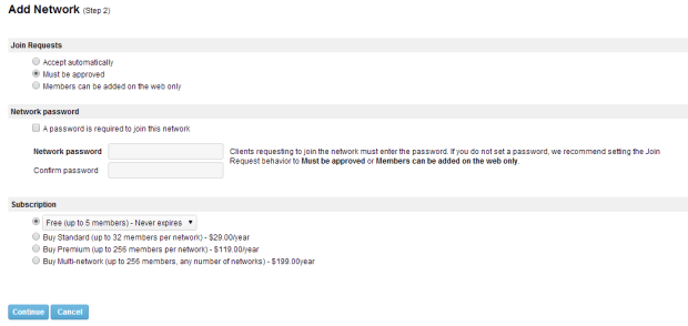 - Setup a network password if needed. I just use the “Must be approved” option, meaning all requests from new clients to connect to the network must be approved by me on the LogMeIn web UI.