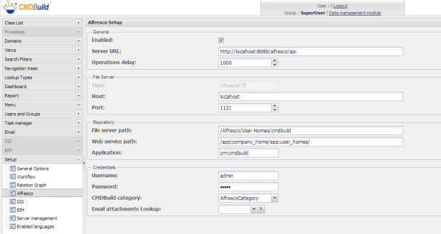 CMDBuild (http://www.cmdbuild.org/en) is a open-source configuration and management tool: It comprises a completely configurable web application to model and manage a database containing assets, and handle related workflow operations. CMDBuild can be used as an asset management system for any kind of assets, as it gives the administrator full flexibility over the asset model and inter-relationships between assets. CMDBuild also provides connectors to other open source components that can be used to extend the usability of the tool, and add features such as document management, automatic inventorying, external authentication, reports, workflows, GIS features, etc. Alfresco DMS can be connected to CMDBuild and used to store “attachments” for any assets defined and tracked within CMDBuild. Refer to my earlier post here to see how to manually install Alfresco on your Tomcat server. Both Alfresco & CMDBuild can be installed on the same instance of Tomcat if needed. I have on my to-do list a set of posts on CMDBuild itself, and how to install/build/configure it. For this tutorial, we assume you have both CMDBuild and Alfresco DMS up and running already on your server. As a pre-configuration check, you may want to login to CMDBuild and open any card: Check the Attachments tab in the Card Pane on the bottom half of your screen. It should be disabled since we haven’t configured the Alfreco connectivity yet. You will see this button get enabled by the end of this tutorial.