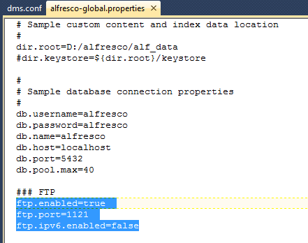 - Find alfresco-global.properties within your Tomcat Alfresco installation (if you followed my earlier post to setup Alfresco, this file would be at <Tomcat Home>/shared/classes. Else you can do a search within <Tomcat Home> to find the file).